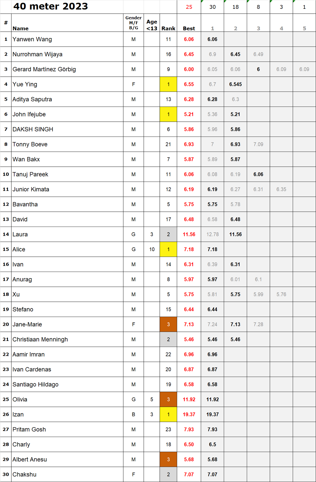 The 40 running competition attracted 30 participants, giving sufficient body to organize several finals. Even though organized at the end of other competitions and the hot afternoon, some interesting battles were fought. 40m female champion was Yeu Ying. John Ifejube defended his 2022 title successfully in between soccer matches. When the field was almost empty some daredevils started for the 1 mile (1400m) cross country. Since there were some imposed restrictions (we were not allowed to use the natural grass, some fences were closed) the runners were instructed to just lap the artificial grass several times. For quite some time 3 runners stayed together, which was under the really warm circumstances a good choice. With the finish approaching some tried to run away, but it was Gerard who had planned most efficiently and also successfully defended his 2022 title.