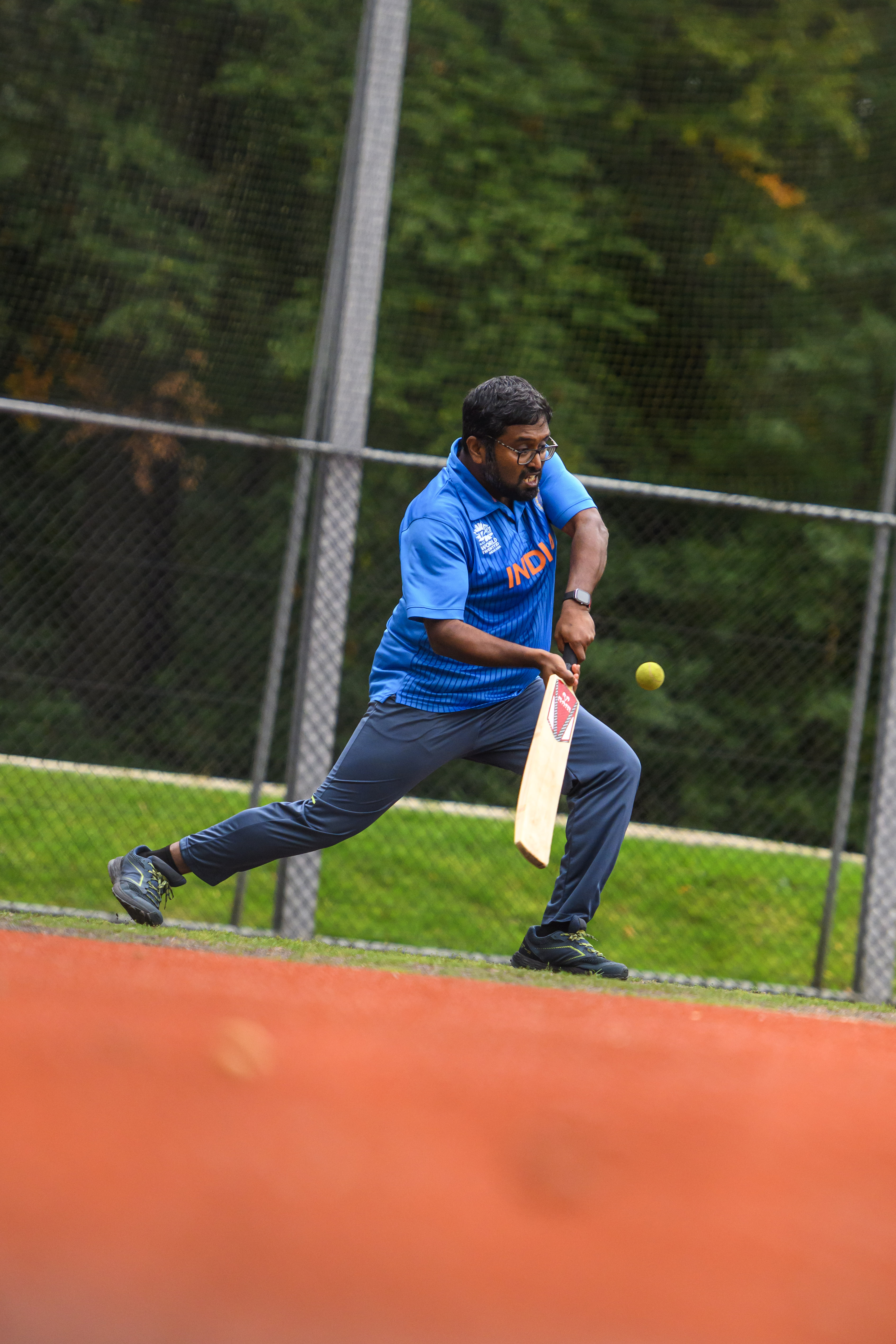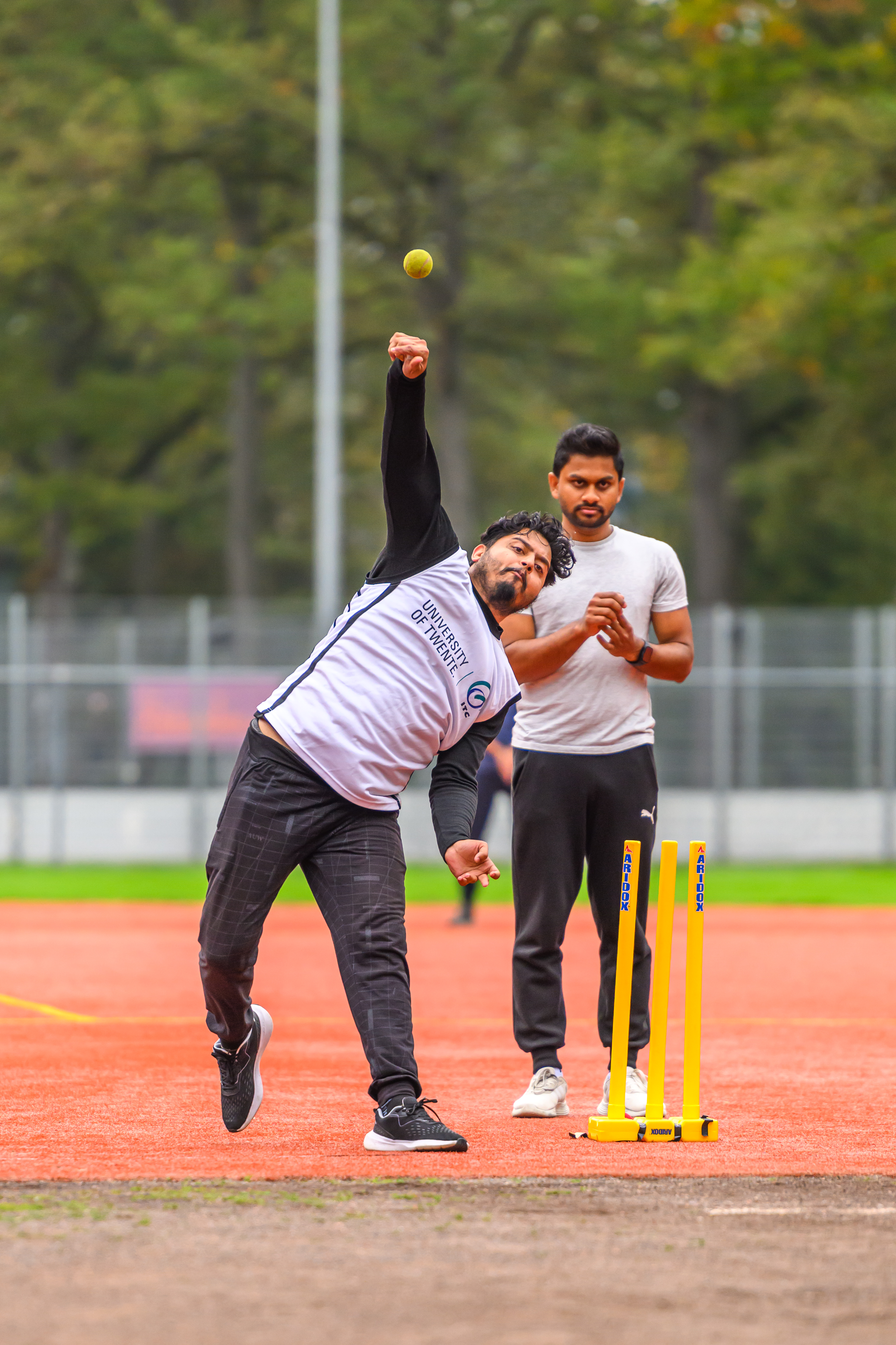 On Wednesday Oct 11 a group of, predominantly Indian, students and staff gathered at the UT Baseball pitch for a cricket clinic organised jointly by SAB and PVI. After a warm up throwing the heavy tennisball, batting with a light and heavier bat, the rules of the game were discussed and settled. Apparently this is also part of playing cricket and one of the many reasons why these games take so long ;-). Two teams were formed and played a match of 10 overs of 6 throws. Both matches were won by one team with respectively 77 and 76 runs. During the matches and certainly before and after the matches some impressive throws by designated bowlers were demonstrated.
