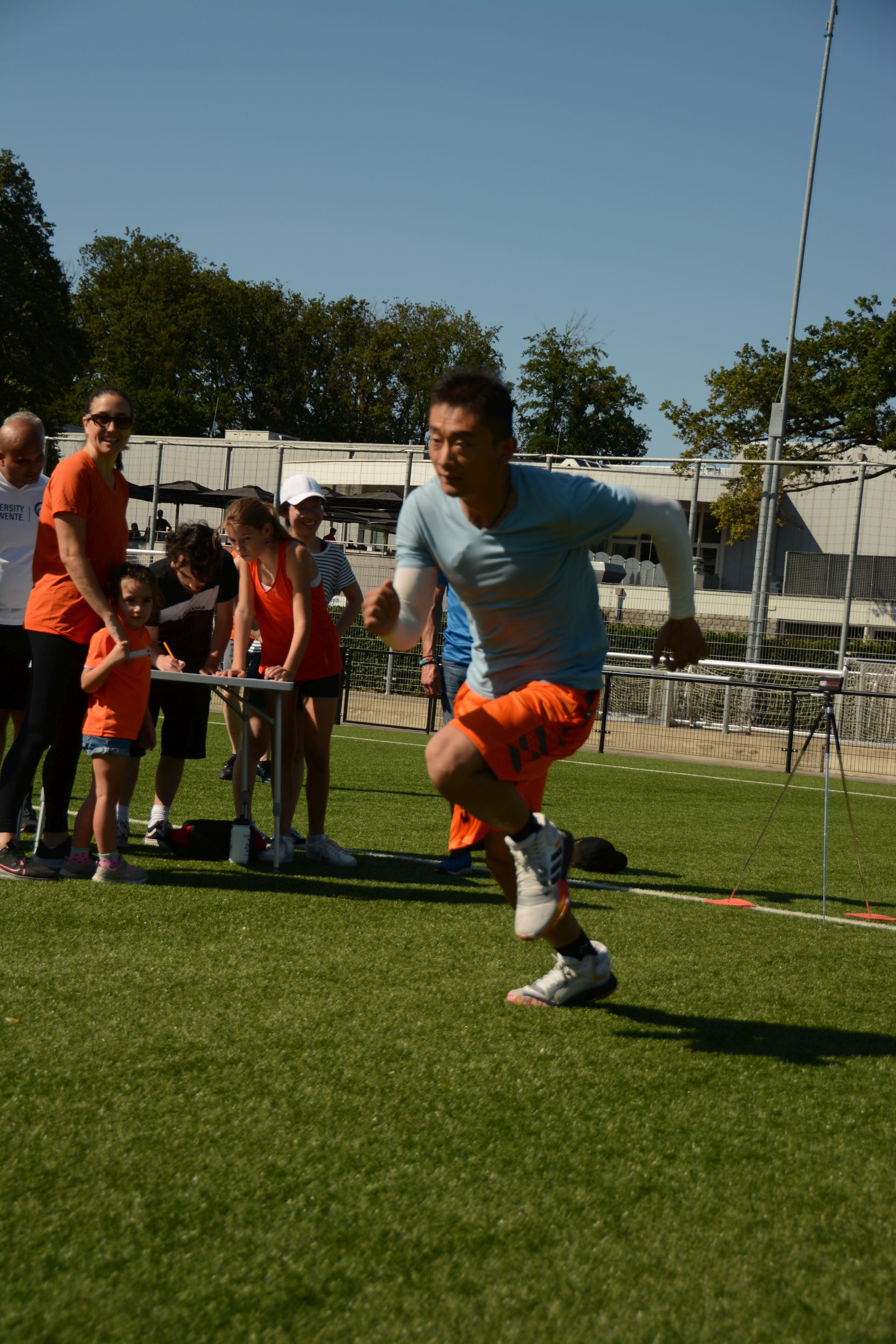 The 40 running competition attracted 30 participants, giving sufficient body to organize several finals. Even though organized at the end of other competitions and the hot afternoon, some interesting battles were fought. 40m female champion was Yeu Ying. John Ifejube defended his 2022 title successfully in between soccer matches. When the field was almost empty some daredevils started for the 1 mile (1400m) cross country. Since there were some imposed restrictions (we were not allowed to use the natural grass, some fences were closed) the runners were instructed to just lap the artificial grass several times. For quite some time 3 runners stayed together, which was under the really warm circumstances a good choice. With the finish approaching some tried to run away, but it was Gerard who had planned most efficiently and also successfully defended his 2022 title.