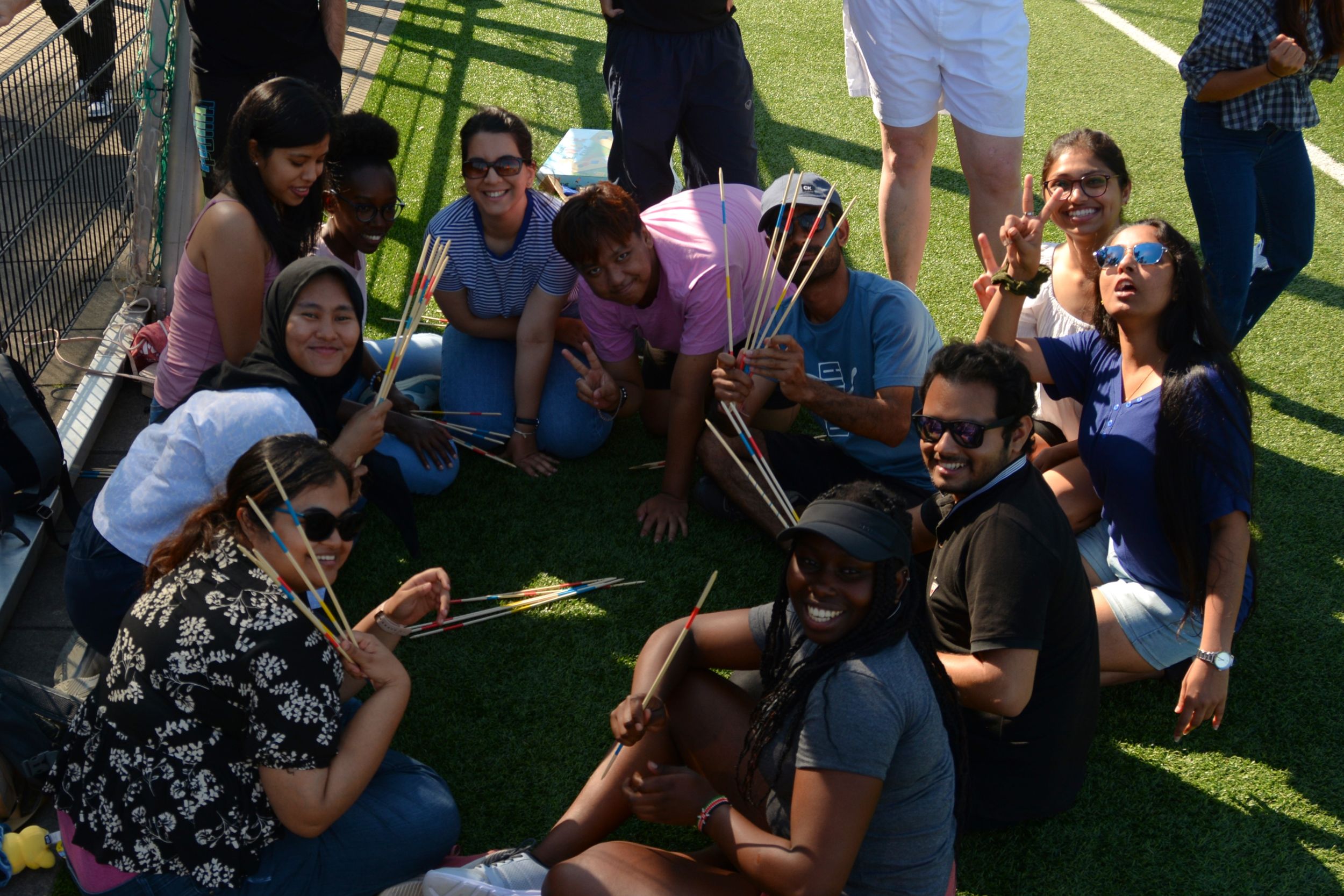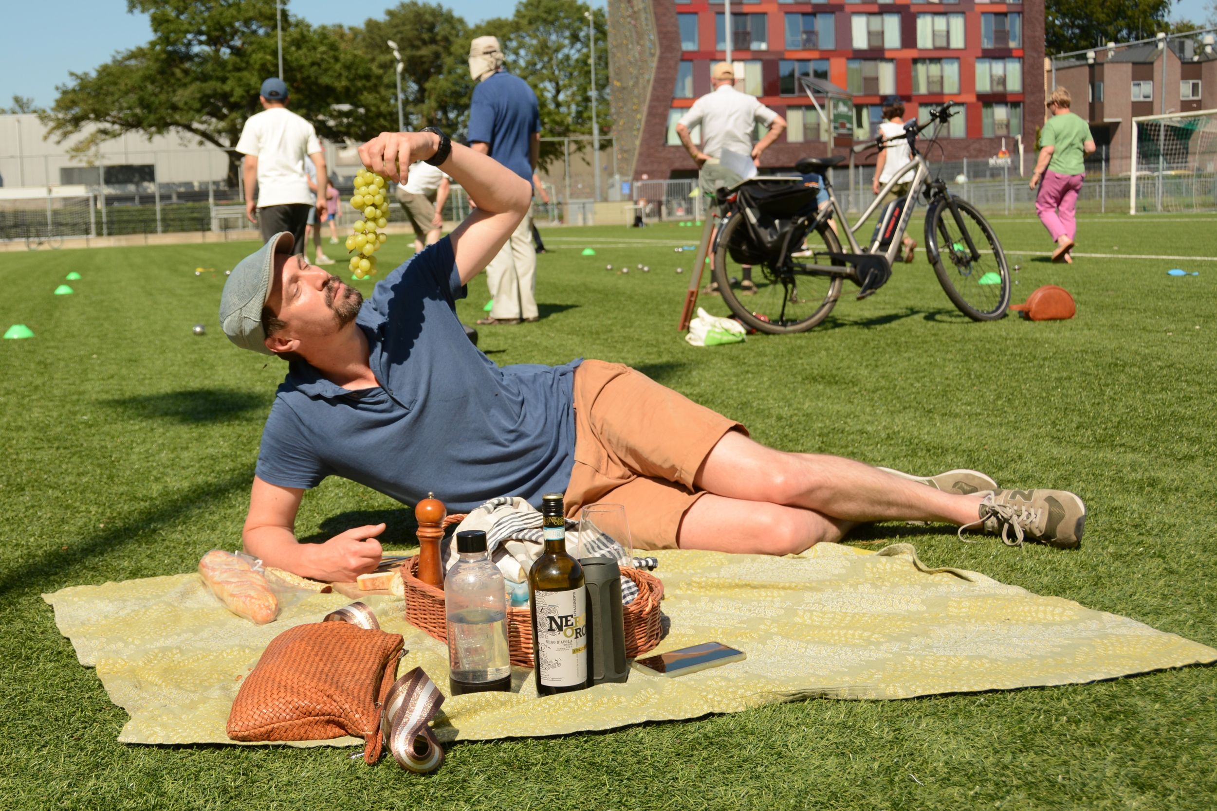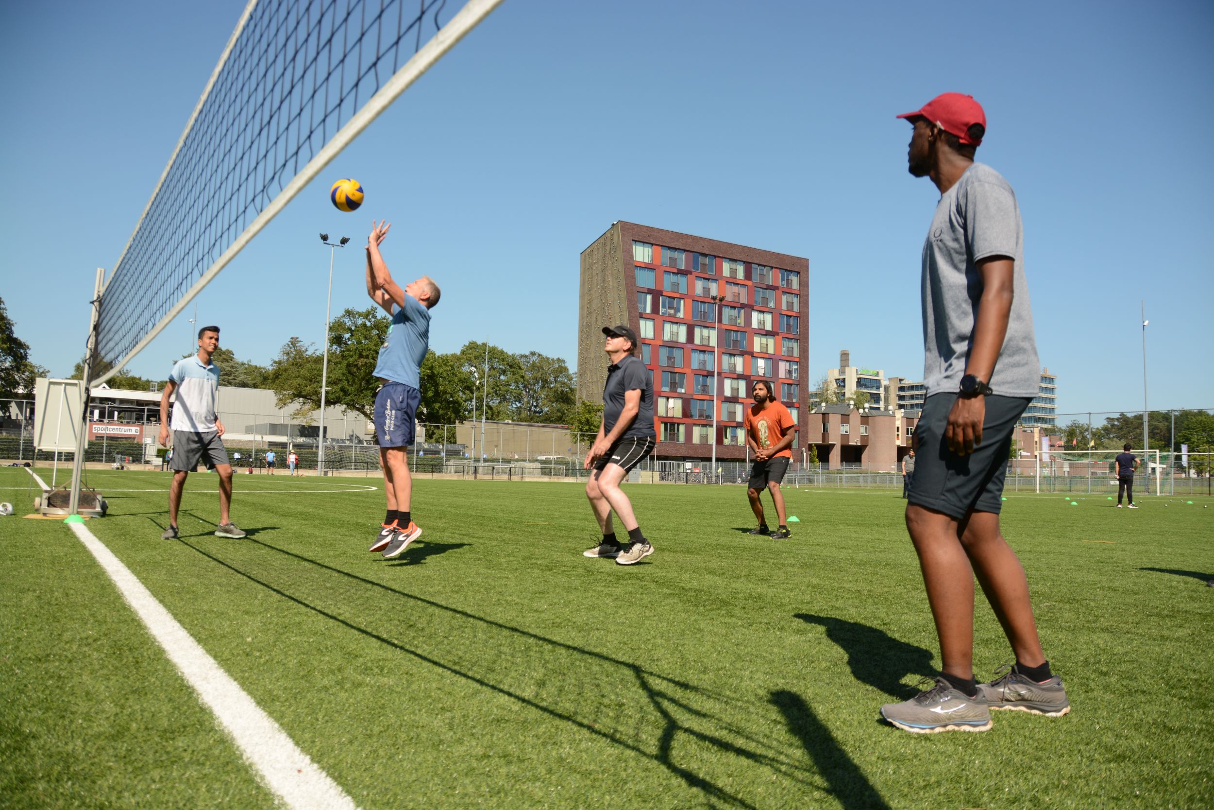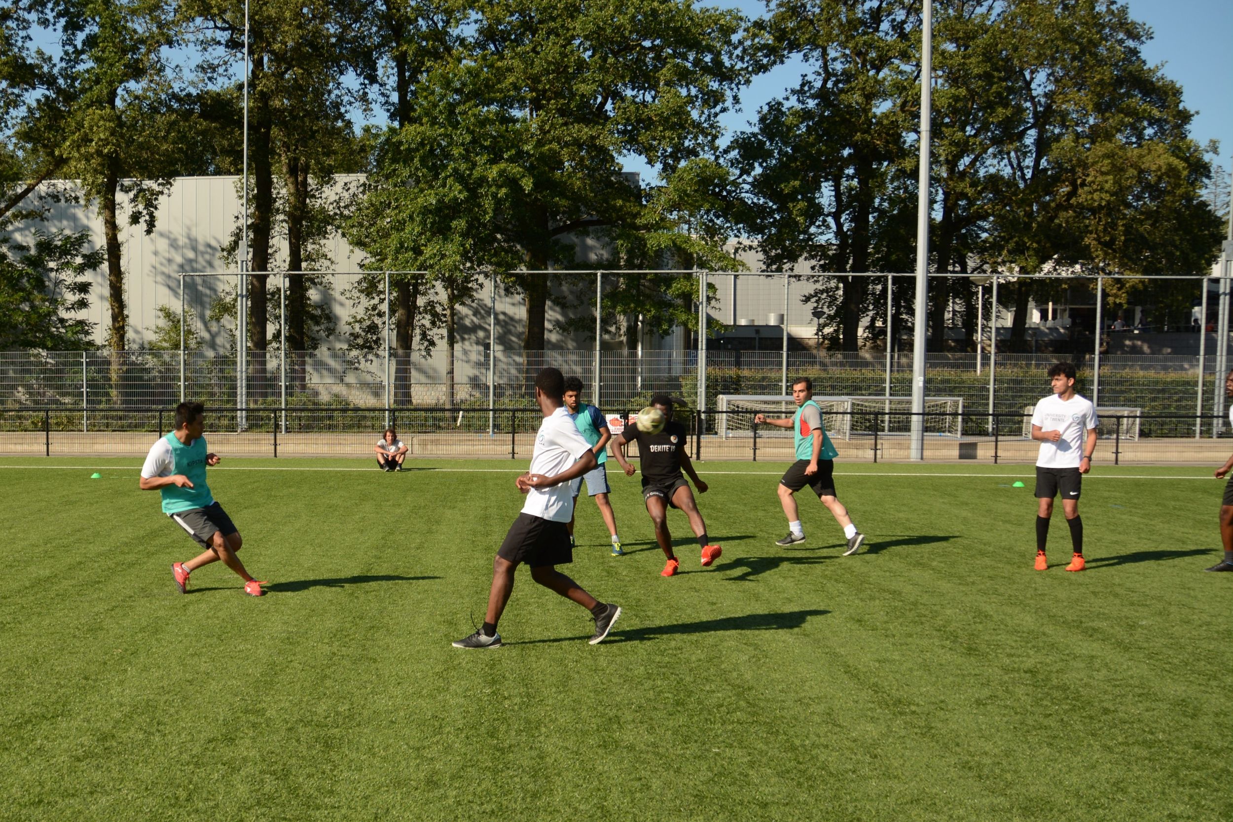 On a blazingly hot Friday afternoon in July some 170 students, staff and volunteers gathered at the UT campus Sports terrain. After our move from the Hengelosestraat to the campus and the merger of our previous host korfbal Rigtersbleek into ERC, the campus sport facilities and café offered an alternative to organize the ITC Sports Day. Next to regular Volleyball, Soccer, Jeu de Boules and running competitions organized by the PVI, the SAB organized back to school games. Since the field we used was artificial grass and the wind felt like a fohn the temperatures on the playing field were rather high. Most supporters and back to school participants clustered together at the far end where some shadow would emerge. But the players were enforced to give their best under the blazing sun. Changing the already intense matches sometimes to heated competitions. At a regular basis athletes were instructed to take a break and drink from the taps in the sport centre at quite a distance. That distance from the terrace to the competition area also made it difficult for those seeking shade and refreshment to follow the competitions.