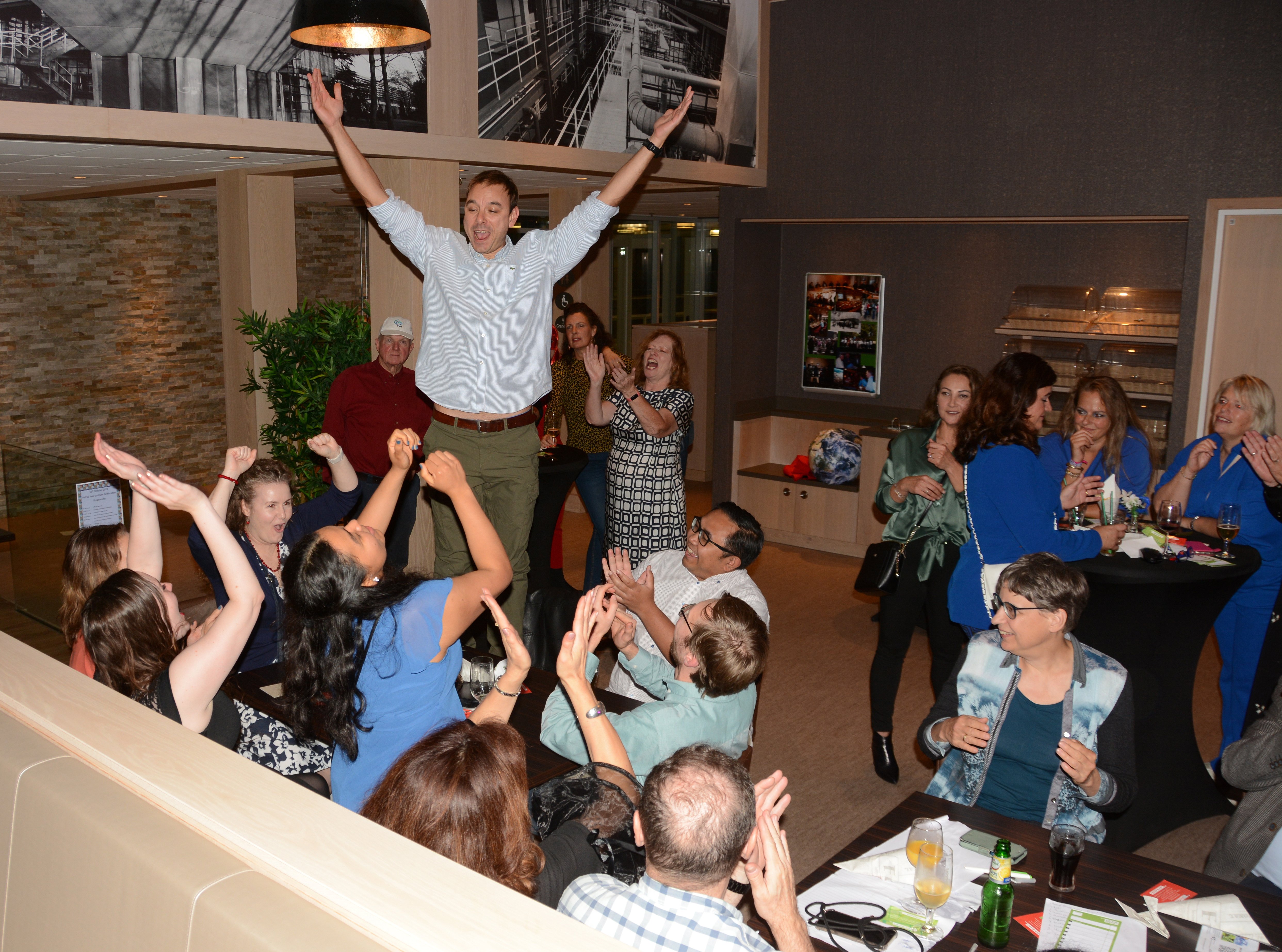 Later that evening the DJ was replaced by a singer and when he started Sweat Caroline almost no one could sit still and a traditional polonaise moved through the Gallery. When the dust had settled, everyone was asked to make groups for the special pub quiz.