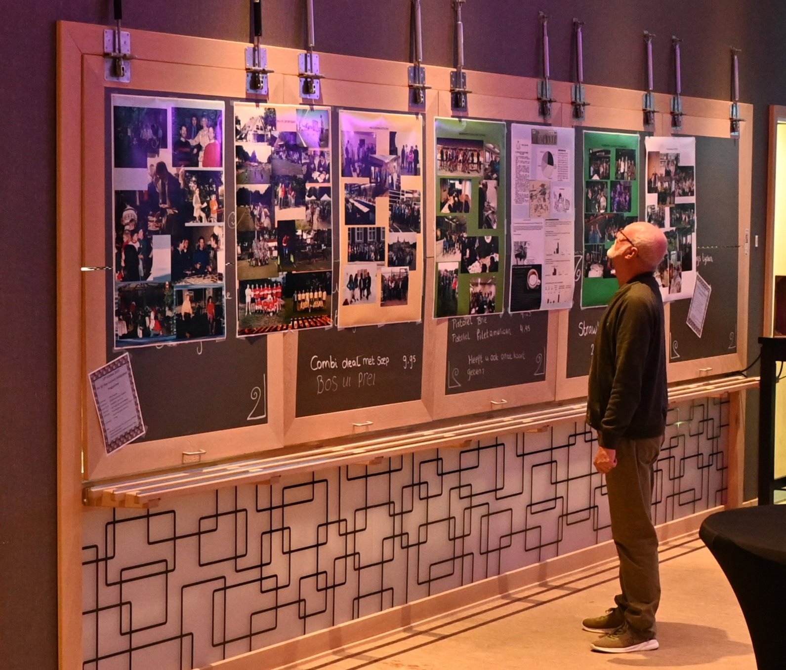 On Friday October 13, PVI organized its 50th anniversary party in the Gallery at the UT campus. The proximity of the festive location to the offices should have been a trigger to register and attend. Some 90 members and partners (and one little baby) gathered from 7 PM at the cocktail tables. It was a mixture of old and new, young and wise. All came dressed for this special occasion and the costume contest on the theme of the four elements: Air, Water, Fire and Earth. The costume contest triggered some to pay special attention to their dress, others came dressed in earth colours or in blue, but were certainly not feeling blue at all. Water was anyhow a central theme, with heavy rain pouring down most of the evening. Chit-chat started immediately, but also the posters with photo’s from PVI activities through the years attracted attention and discussion. It was quite difficult to identify the youngsters on many photographs.