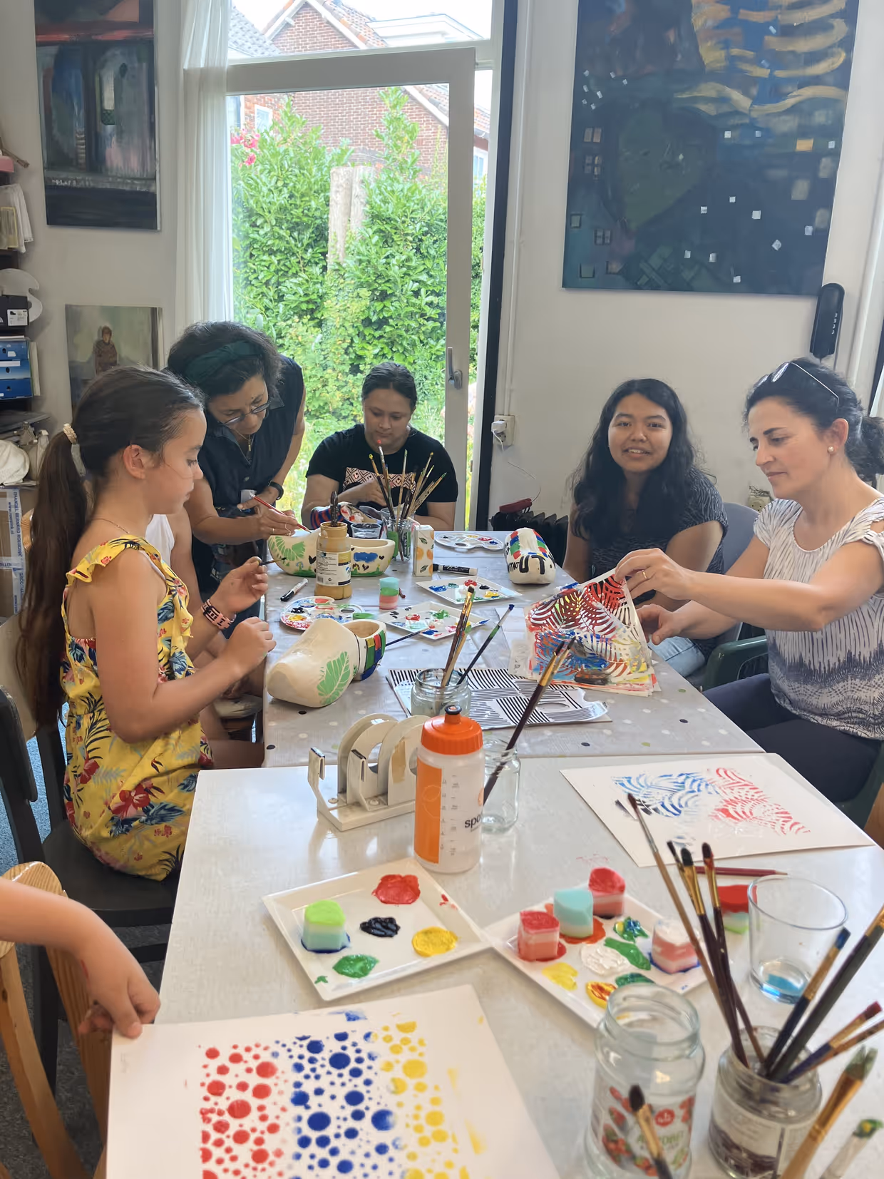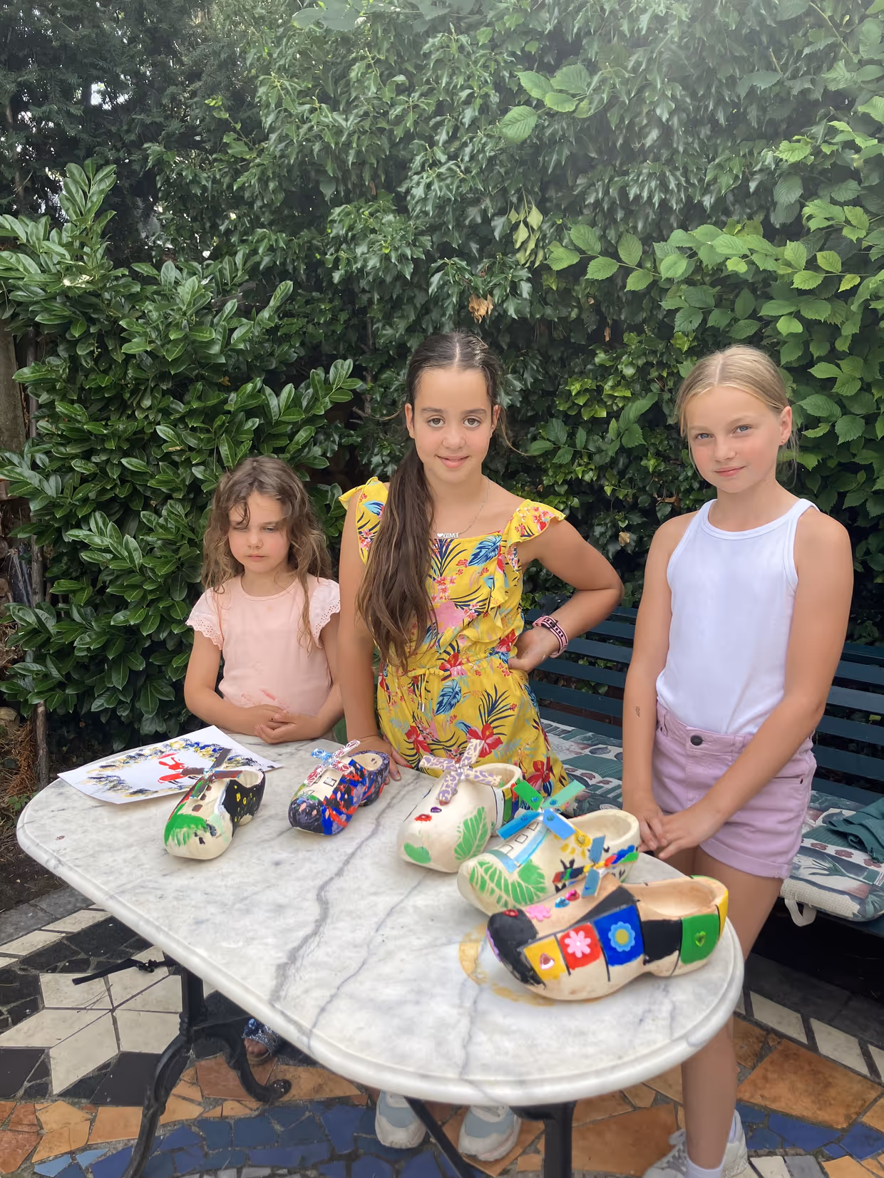On the 14th of July the PVI organised a fun and creative workshop in “clog-shoe” painting. The event was organized in Luz’ painting atelier on a beautiful and sunny afternoon in Enschede. A total of 12 children, both boys and girls painted colourful and creative drawings, either free-hand or with the help of stencils on the white clogshoes. On the nose of the clogshoe a little “windmill” was placed to give it an extra Dutch touch!