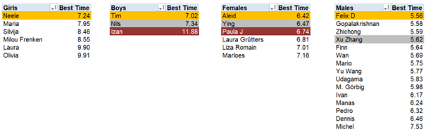 Especially the children on and around took their chances and ran not just once or twice but some even 9 times the 40 meter. Even though it was clear that after 3-4 runs you would hardly be able to set your best time. There was only one exception: Milou Frenken ran her best time in her 7th attempt. At the end of the afternoon 3 finals were scheduled since only Neele was present for the girls final. After a convincing comment that she would always win because she was the only girl, she accepted to run In the boys final against her two older brothers. And what a final that was. The 8-year-old Neele pushed her 13-year-old brother Tim to the limits and crossed the finish line first. The female final was won by Aleid, who also played football, just before Ying and Paula. Since the finish was close, a video referee decision was required. The men’s final required some adaptation because one of the qualifiers was limping around with cramp. Despite the change it should be a thrilling final because the fastest qualifier (Felix 5.56) and number 6 (Wan 5.69s) were only 0.13 seconds apart. Felix and Xu indeed battled 40 meters to decide who would succeed John Ifejube: Felix.