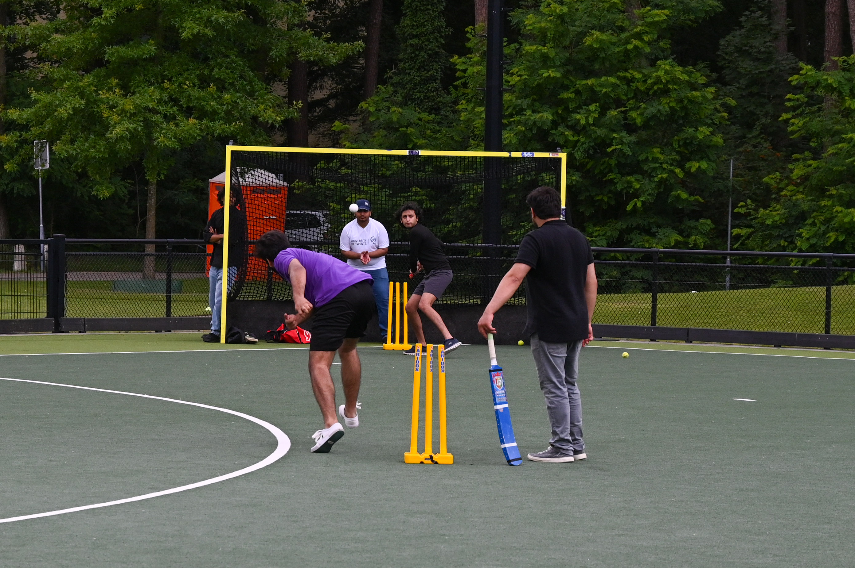 Despite the regulation that box cricket can be played in a relatively small area, the ball was sometimes hit hard and high to fly over all other sports or into the bushes behind the wicket. It was clear that many of the ITC students from the Asian region where they play cricket could throw the ball and hit the ball full speed. For the occasion a tennis ball was tapered to make it less bouncy and harder.