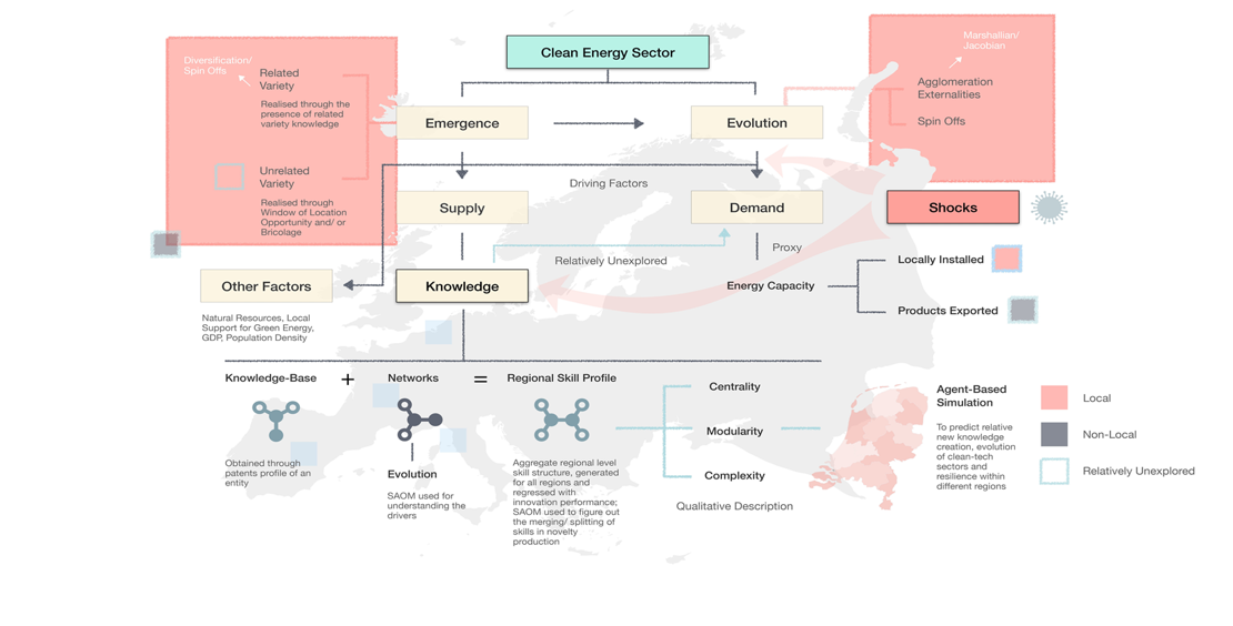 The research also intends to study the co-evolutionary dynamics between the local knowledge production and demand creation, as well as the competing technologies contesting the process of diversification. Finally, the research aims to investigate the resilience of regional knowledge production, and niche and regime formation dynamics, when exposed to external (economic) shocks and tries to simulate possible regional resilience scenarios. The study makes use of statistical analysis methods (including, OLS regression, Bayesian survival analysis, etc.), network analysis methods (SNA, SAOM, etc.) as well as an agent-based simulation model for the above-intended purposes.