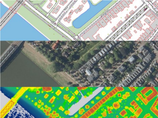 Figure BGT map data (top) and airborne sensor data (middle: 2D aerial image, bottom: 3D lidar point cloud)