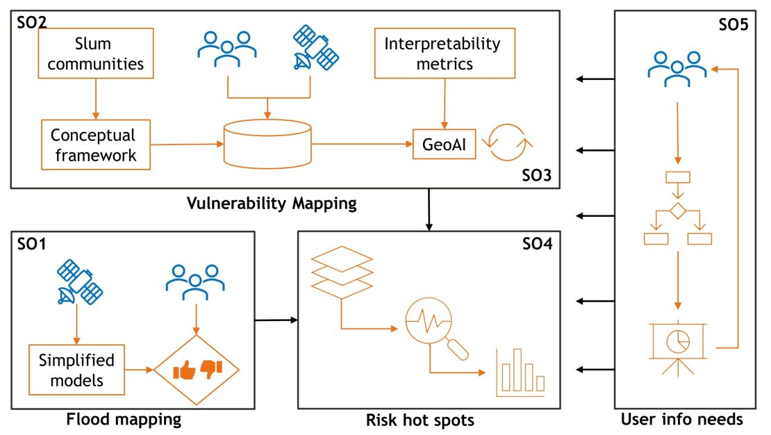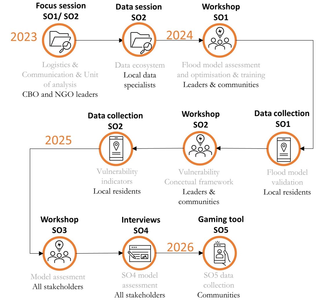 The operationalization of this research will initially take place in Nairobi and Kisumu (Kenya), and I will strive to replicate the methodologies in Ghana (Accra and Tema) and Nigeria (Lagos and Akure). I propose five sub-objectives: : (1) to test the performance of simplified flood models and globally available data to map flood events in slum contexts and locally optimising and validating the outputs with stakeholders; (2) to co-design a conceptual framework with local stakeholders to conceptualise urban flood vulnerability that is relevant for slum contexts using CS and EO data; (3) to apply this framework and assess the interpretability of the proposed EO- and CS-based indicators; (4) to analyse the resulting flood risk hotspots, i.e., to locate the most vulnerable groups across and within each study area; and, finally, (5) to identify the information needs and preferences of slum residents regarding risk and vulnerability assessments and translate them into communication and visualization strategies.
