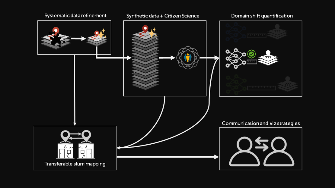 The current paradigm of AI development has been model-centric, where the focus has been building new network architectures or loss functions or new ways to optimize hyperparameters. However, data-centric AI (DCAI), veers away from touching the models themselves and instead pushes for ensuring the quality of the input datasets in a systematic and semi- or fully-automated manner. We employ DCAI to potentially improve the spatial transferability of slum mapping models in a data-scarce environment. To achieve this, we will (1) develop a systematic data refinement method to reduce and "clean" original input data and then (2) train several models for different cities using synthetic imagery labelled using citizen science. From these models, we will (3) select the optimal model by quantifying the domain shift between all trained models and unseen datasets (from other cities). Lastly, throughout the research, we will, (4) with the local stakeholders and slum dwellers, co-develop communication and visualization strategies of the research outputs .