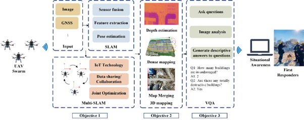 The project aims to create an effective tool to establish situational awareness in emergency environments and facilitate the implementation of post-disaster rescue efforts. The expected outcome is to develop UAV swarm-based multi-SLAM and VQA algorithms for emergency environments for constructing 3D maps and delivering descriptive answers to FRs.