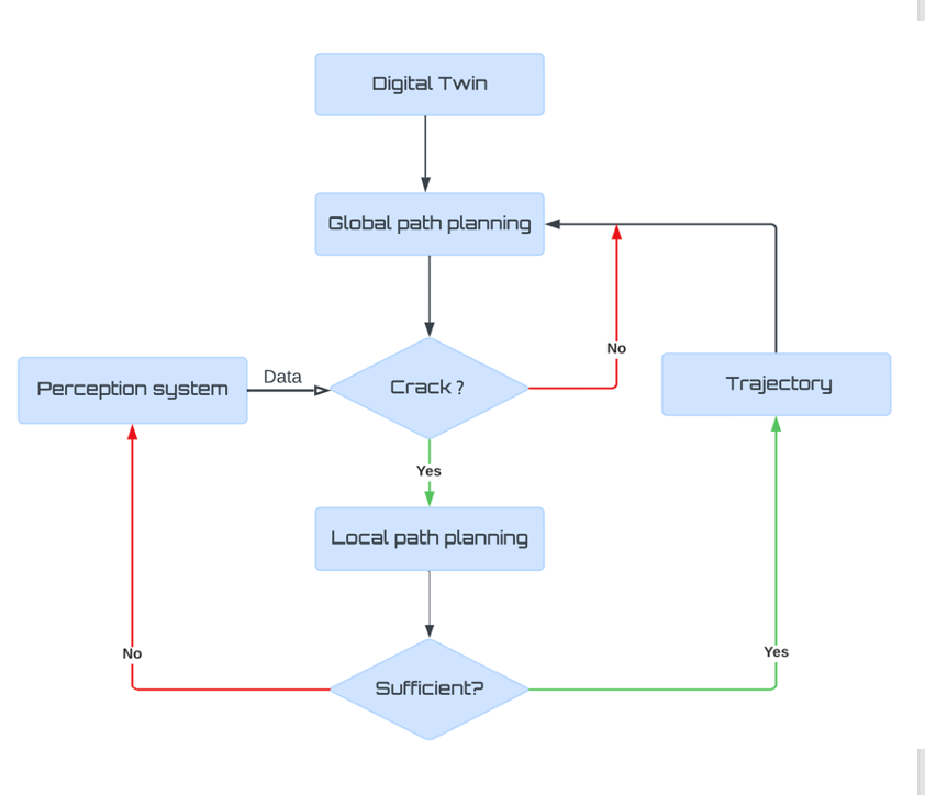 Here we focus on cracks in concrete bridges because they are part of the most common and important parameters to evaluate a bridge's serviceability. The main objective of this research is to design and execute an innovative crack-detecting Unmanned Aerial Vehicle setup for three-dimensional modelling of concrete bridges. The primary purpose is to design an active path planning of autonomous crack detection using UAV and integrate crack information into dense 3D point cloud as well as the corresponding digital twin with the aid of advanced algorithms and technologies thereby improving the maintenance and safety protocols in bridges.