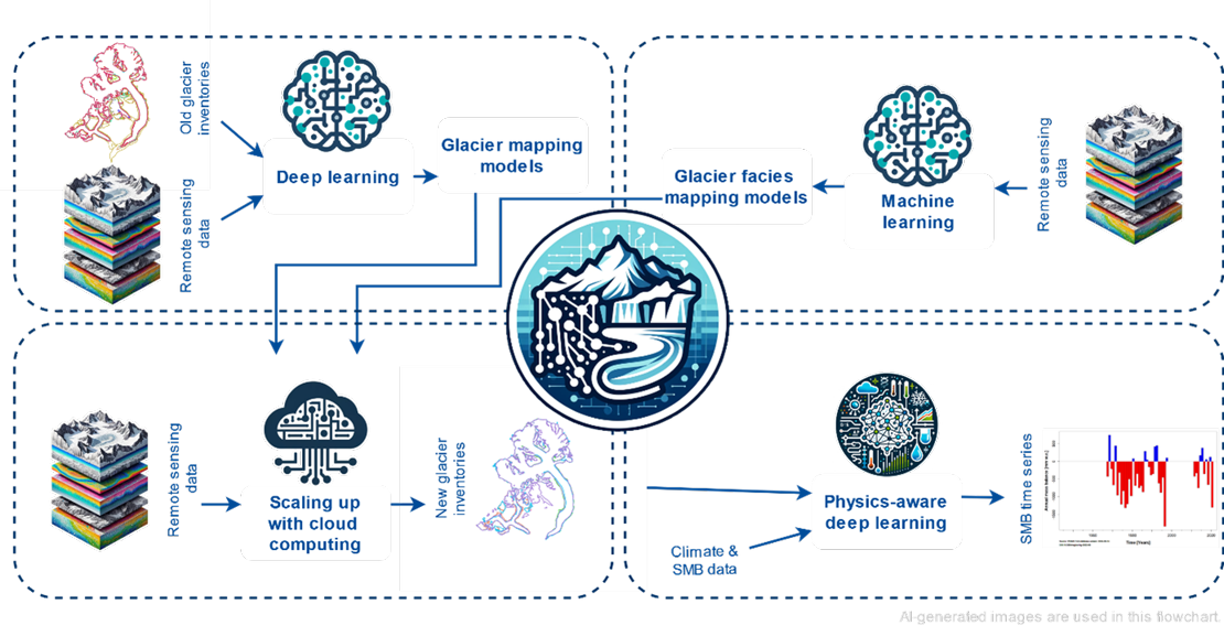 To quantify and deal with the aforementioned challenges, there is a need for consistent global multitemporal glacier inventories and glacier mass balance datasets. Unfortunately, these data are missing, and there are no fully automated methods validated globally to produce them. Thus the overarching goal of this project is to produce a large-scale inventory including detailed glacier maps and surface mass balance time series and make it available to the wider scientific community. To achieve it, we will 1. develop a method based on convolutional neural networks for mapping glacier outlines and 2. a machine learning method for classifying glacier facies, 3. scale up these methods to map glaciers globally and 4. develop a physics-aware model for glacier-wide surface mass balance estimation.