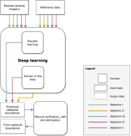 This Ph.D. project will investigate the application of state-of-the-art deep learning models in combination with remotely sensed imagery for cadastral mapping purposes. The main objectives of this research are (figure):